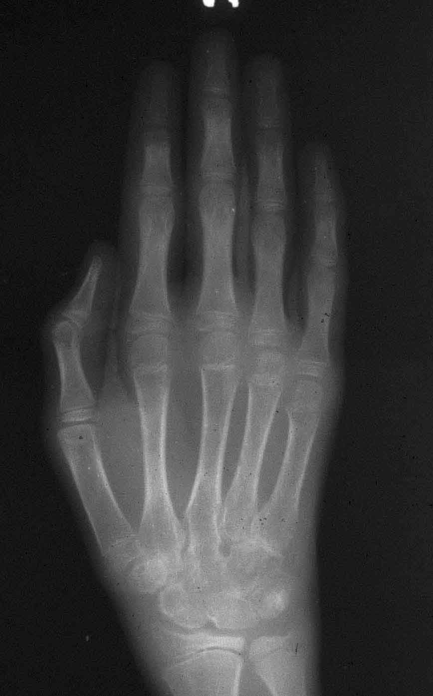 Description | This radiograph of a child's hand with advanced polyarticular JRA shows subarticular osteopenia and fusion of the metacarpal bones. |