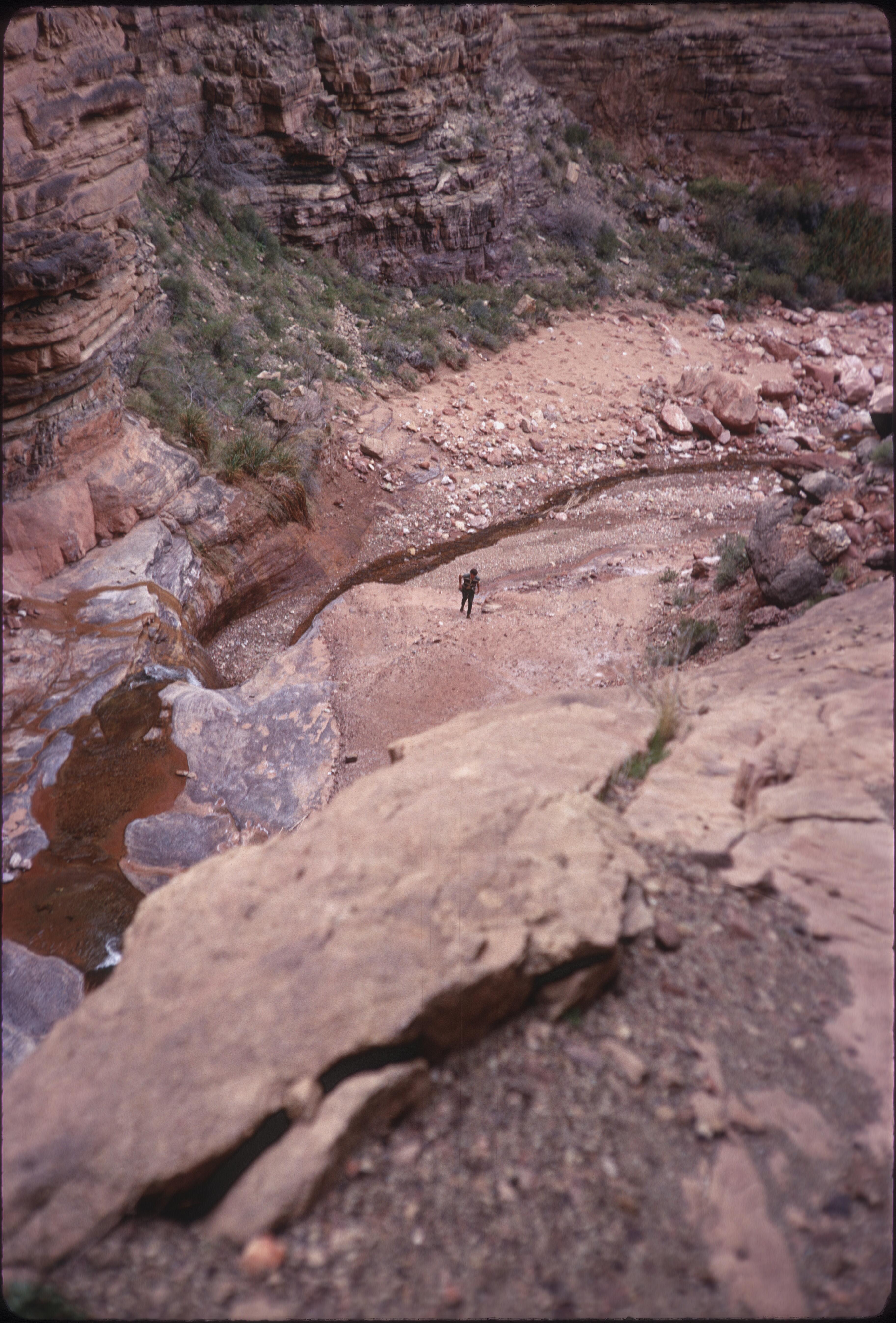 Color 35-mm slide photograph of a view of a person walking in a side canyon, probably near the Colorado River in the Grand Canyon area, Arizona. A small waterfall is to the left of the hiker. Slide developed in April of 1969. |