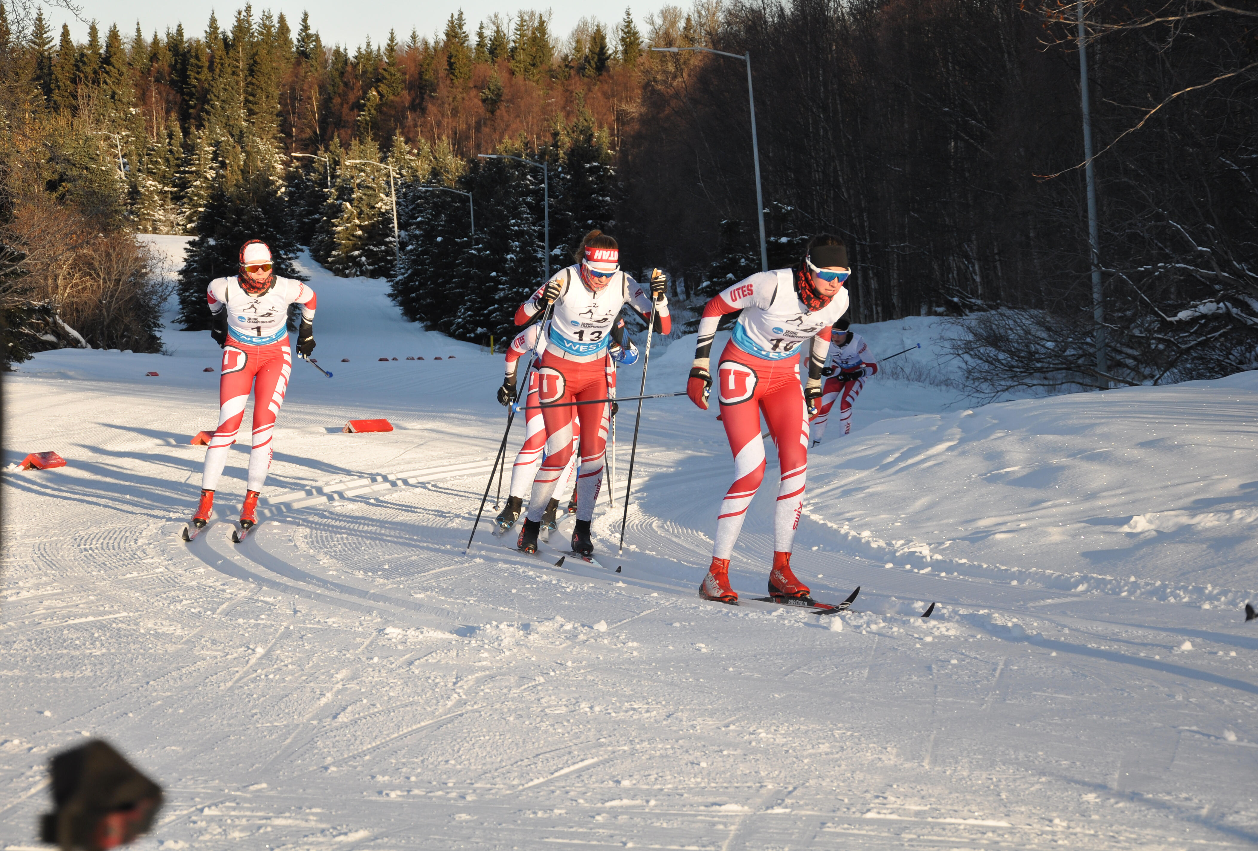 | Description | Color photograph of Leah Lange, Guro Jordheim, and Karianne Moe, members of the 2019-2020 University of Utah Nordic Ski Team competing in a ski tournament in Alaska. |
