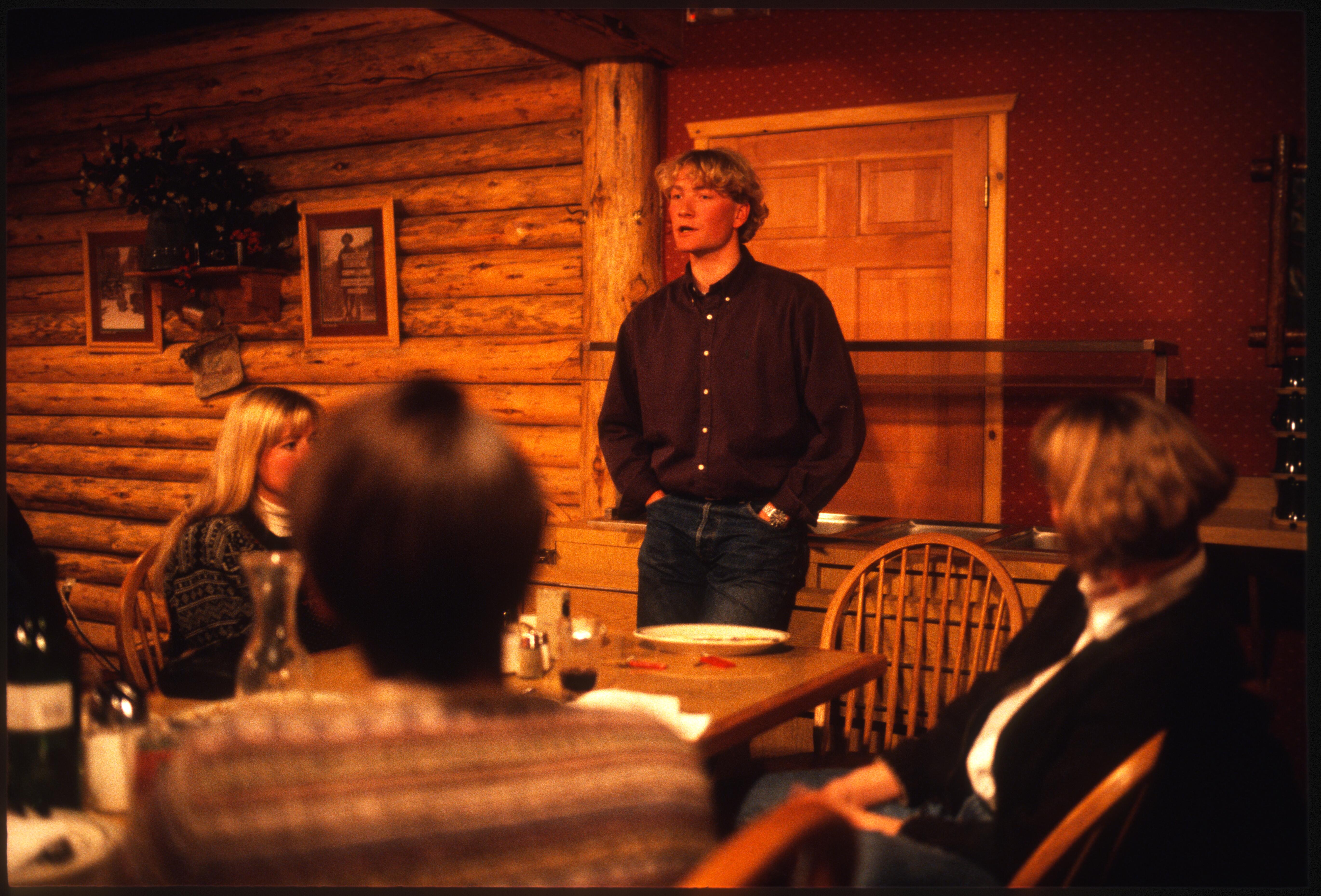 | Description | Color slide photograph of the University of Utah ski team members, at a social event, circa 1990s. |