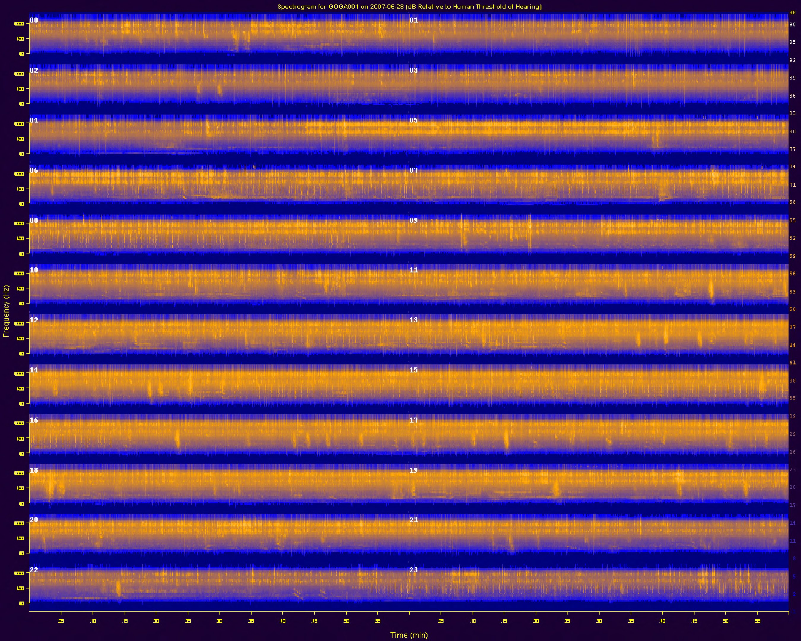 Each spectrogram has two versions with identical metadata for each date and location. Those spectrograms labeled with an ''h'' are adjusted to show only the sounds from the recording that are humanly audible, while their corollaries (without an ''h'') show the full spectrum of the recording. Spectral images are taken from calibrated sound level measurements and are displayed in 1/3 octave band frequencies on a logarithmic scale from 0-4000 Hertz. |