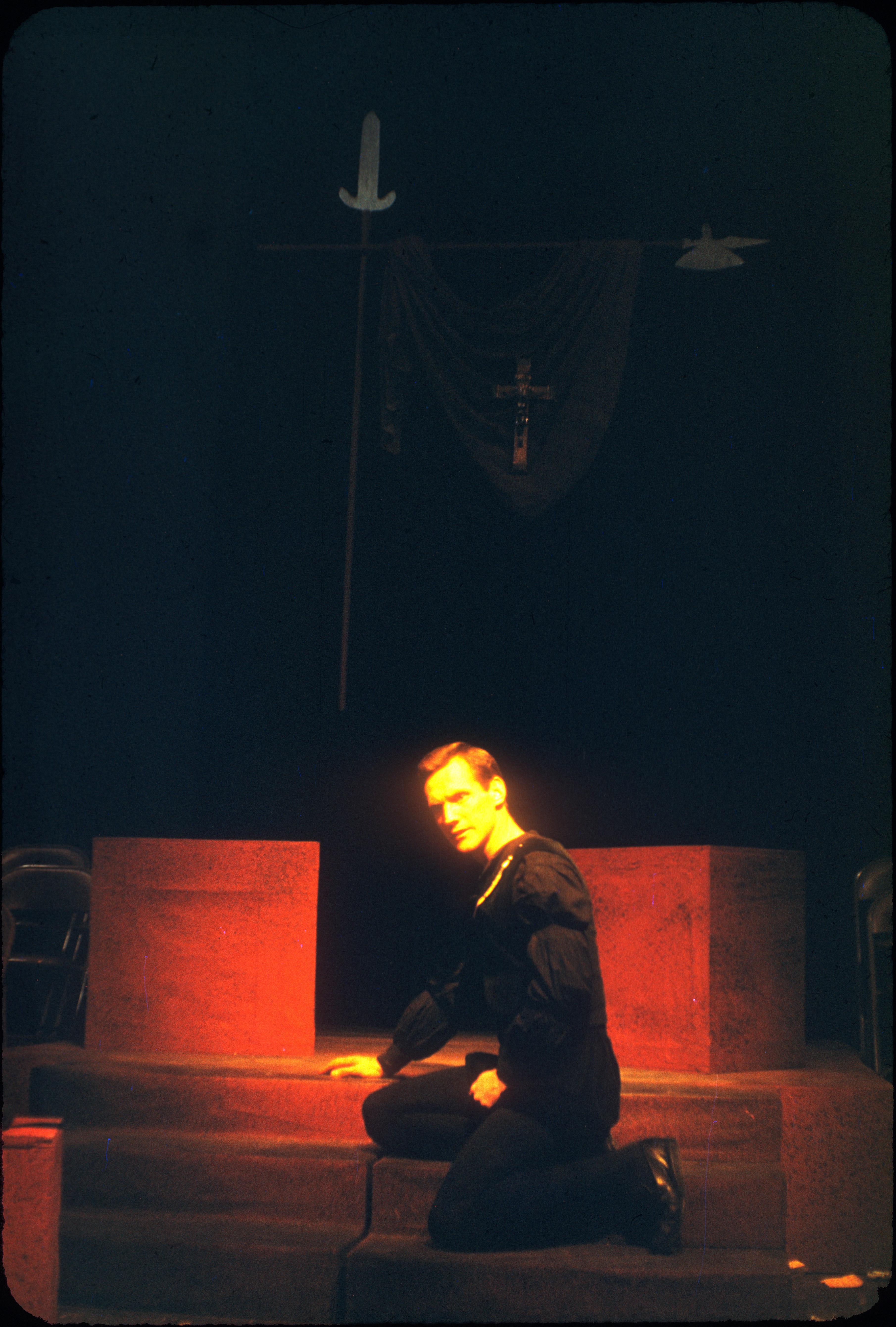 Color slide photograph showing a scene from the abridged production of William Shakespeare's "Hamlet," performed at The Playbox Theatre-in-the-Round (Little Theatre), University of Utah, January 12-16 and 18-19, 1954. |