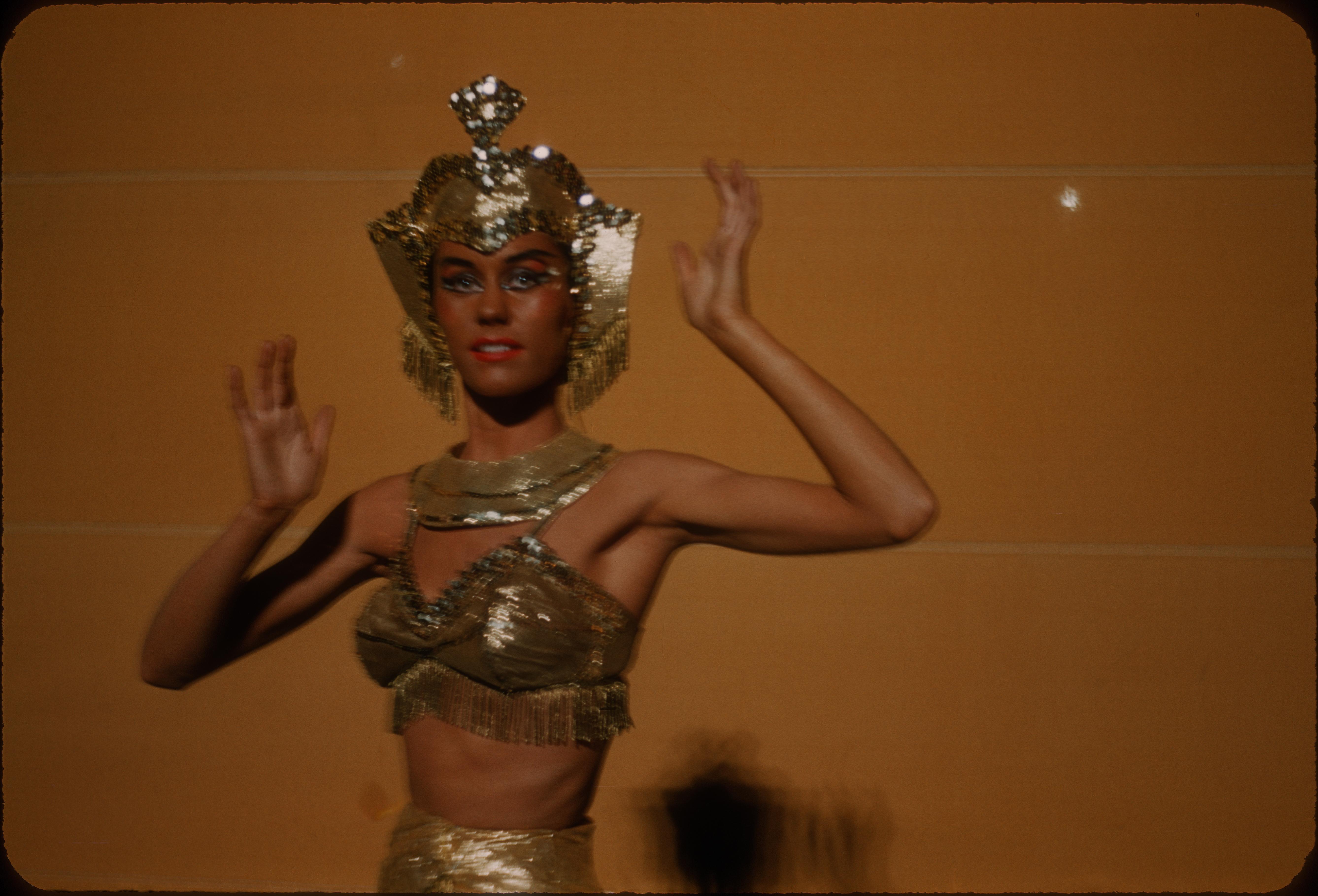 Color slide photograph of Prima Ballerina Sally Baily as priestess in a production of Verdi's "Aida," performed at Ute Stadium, University of Utah, as part of the Summer Festival, July 25, 28, and 30-31, 1954. |