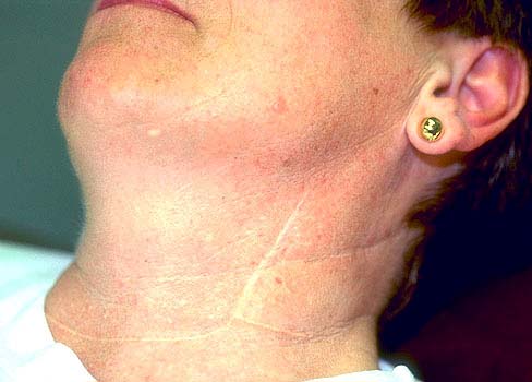 This patient had radiation therapy for her acne vulgaris, and has a scar demonstrating previous thyroidectomy for thyroid cancer presumably induced by the radiation, and has developed a basal cell carcinoma on her left cheek. |
