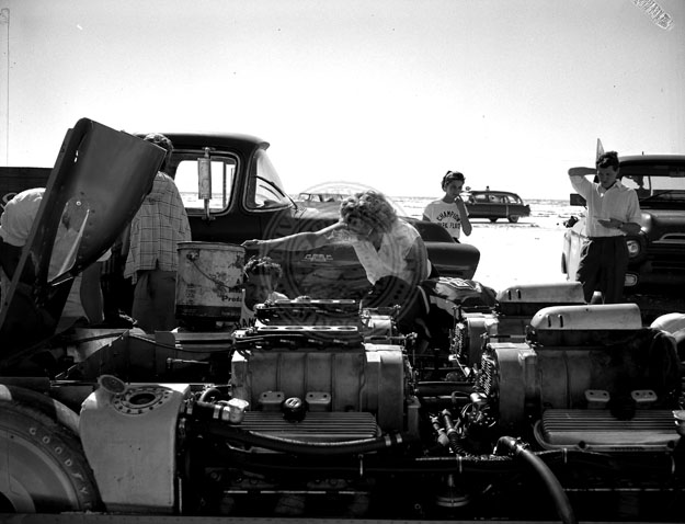 | Description | Photo of crew members working on Mickey Thompson's racing vehicle the "Challenger" on the Bonneville Salt Flats Raceway in 1960. The woman leaning over (third from right) is probably Thompson's wife Trudy Thompson |